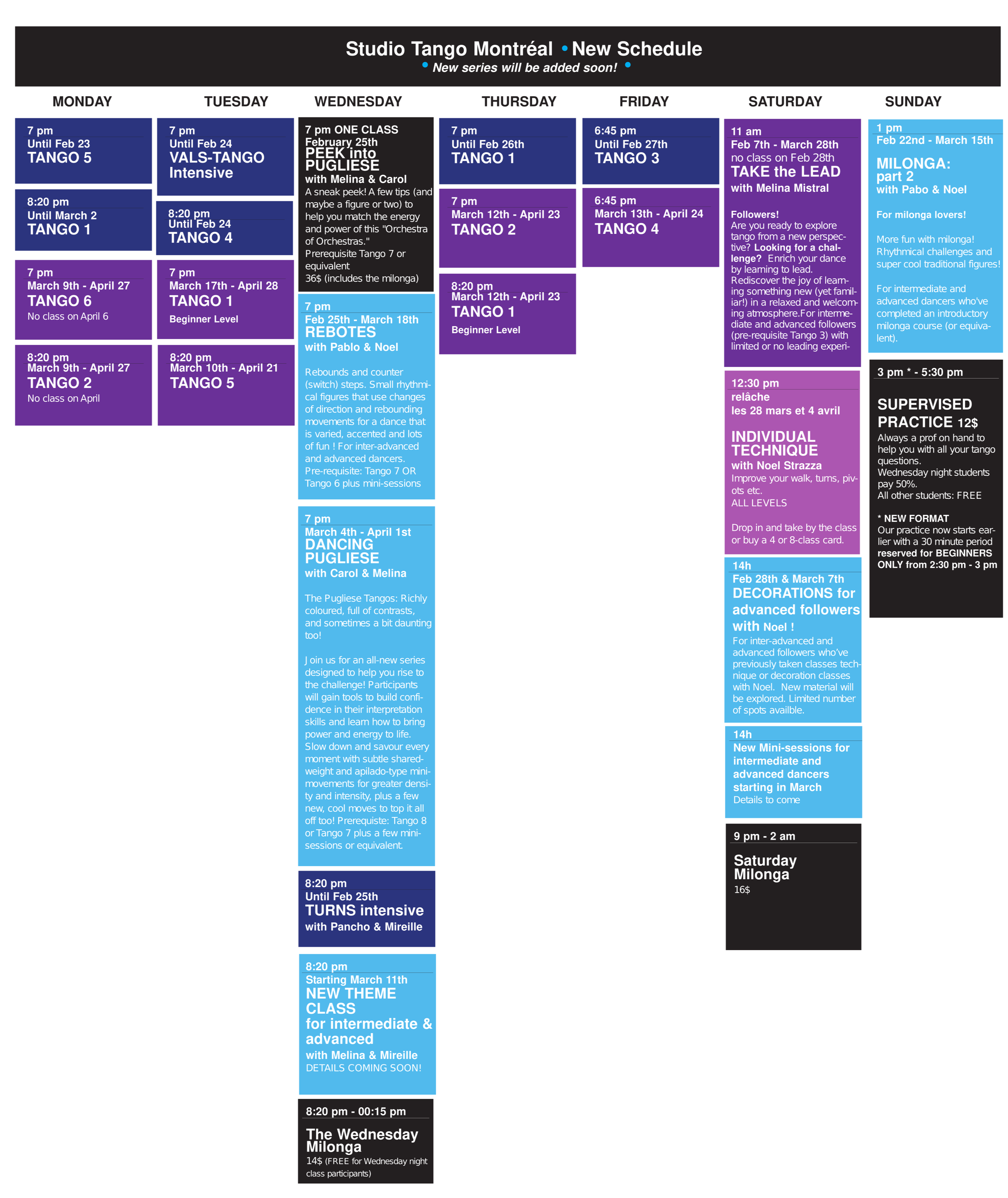 6 classes x 1h15 = $210 (includes taxes, free entry to the milonga and to the Monday practice)