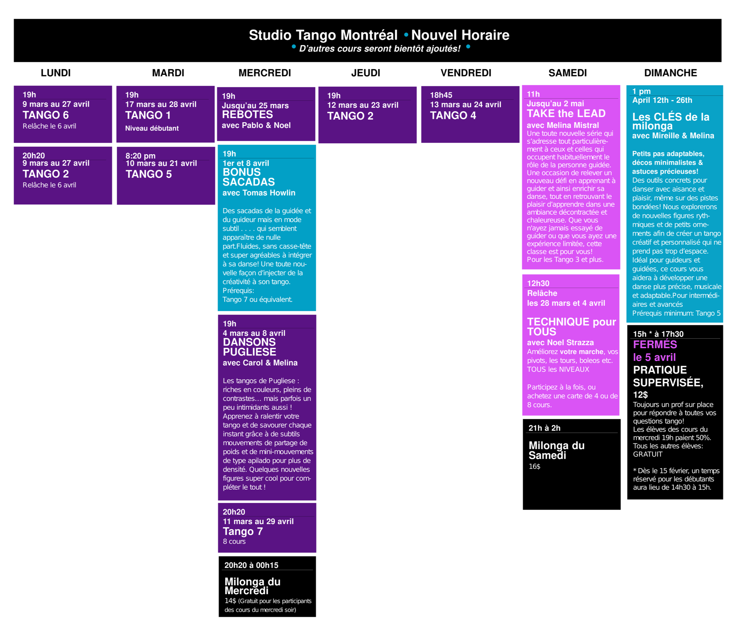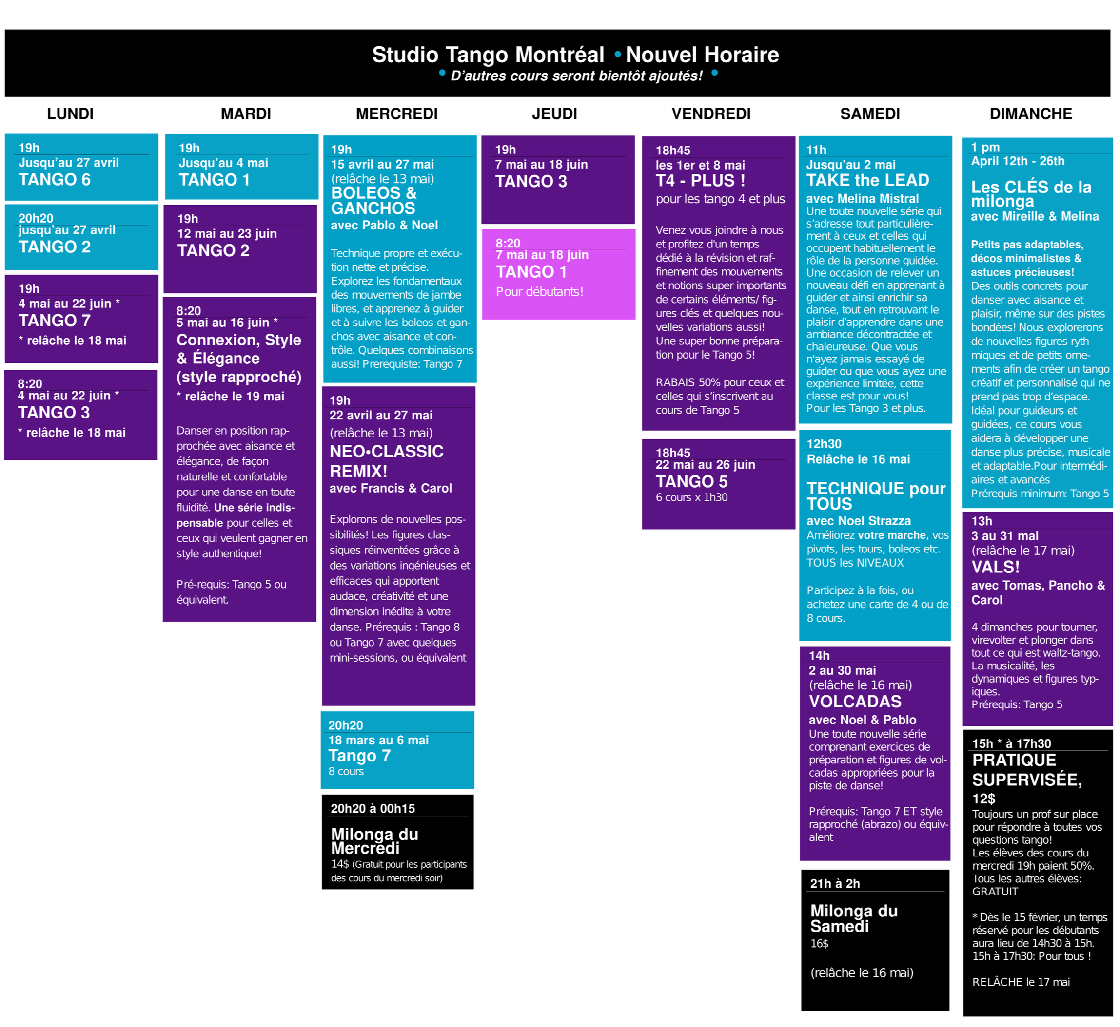 les cours de tango, les ateliers, les soirées dansantes et plus encore!