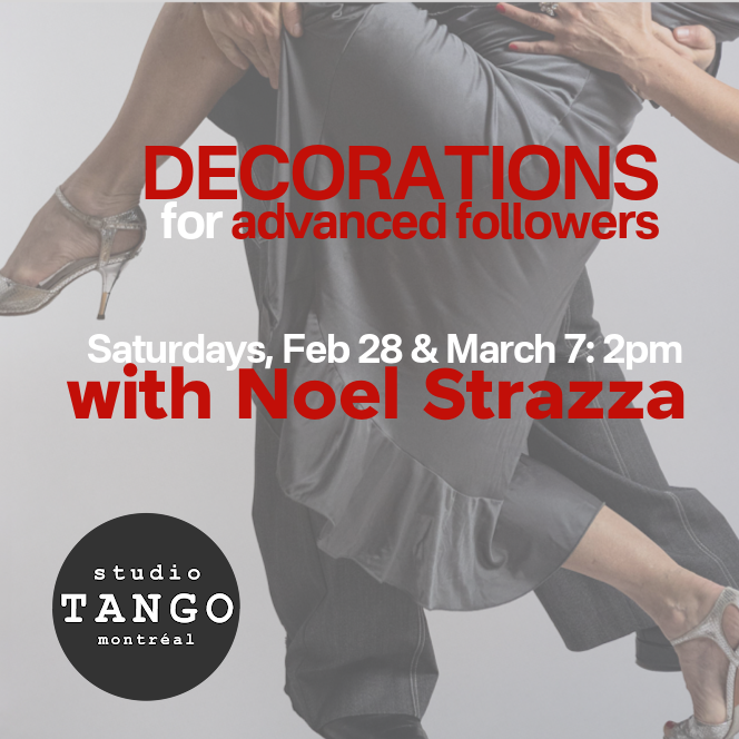 Prerequisite: for inter-advanced and advanced followers (suggested level Tango 6 min) who have taken technique classes with Noel.
